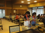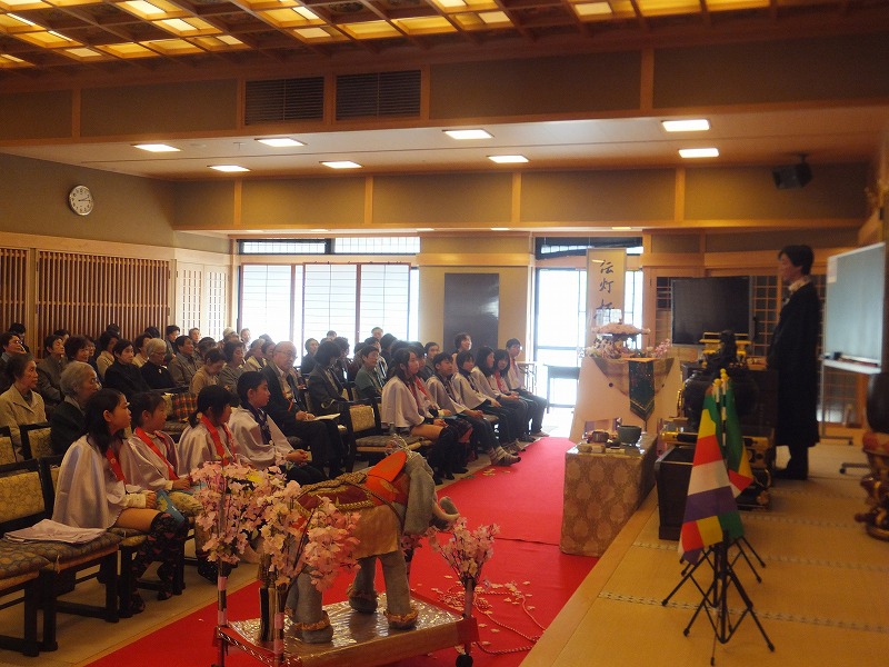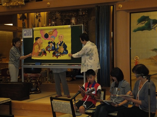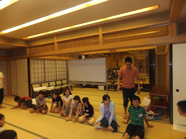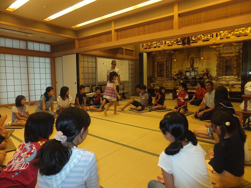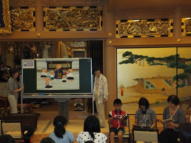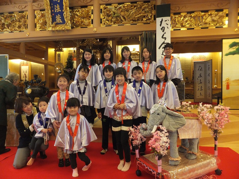 お寺で楽しむ一年間2014年 4月 花まつり 8月 夏休みお楽しみ会 12月 おもちつき会 4月 花まつり 昨年誕生した,ごくらく寺の皆さんによる手作り象さん 博(はく)象くん&さくらちゃん1才を迎え歩けるようになりました。 子供さんで花まつり象さんの行進をしました。さくらちゃんは、幼稚園&小学生低学年お友達と共に行進。 博(はく)象くんは、小学校卒業生と共に行進です。 お祝いのハンドベル演奏 恩徳讃 象さんの行進を終えてホッと一息。 お彼岸法座、鍋島直樹先生のお話を、子供さんと一緒に聞きました。 小学校卒業生 花御堂の前で記念写真 中学生になっても、お寺にいつでも遊びにきてくださいね。 8月 夏休みお楽しみ会 2014年のお楽しみ会は、昨年に引き続き、しんちゃん先生&そうちゃん先生をお迎えし、楽しい時間をすごしました。 ちかいのことば「仏の子は、必ず約束を守ります。」 紙芝居「一休さん」 川辺さんの手作り。 紙芝居もナレーションも、プロ並みで、感動しました。 楽しみにしていたゲームの時間がはじまりました。 大盛り上がりのゲームに みんな笑顔に。 先生方の名リードにみんな夢中。しんちゃん先生そうちゃん先生ありがとうございます。こども会一同より おやつは、かき氷。みんなで食べると一層おいしいですよね。いちごにカルピス、練乳が人気でしたね。 食後は、イラストリレーゲーム。順番に前の人の絵を見て、描いていくののですが、、、。ライオンからネコ、違う動物になってますよ! 最後はあみだ様のお灯明をいただきキャンドルサービス。 六年生が、夏休みの思い出、今日のお楽み会の感想を発表しました。楽しかった~。一番の思い出ができました。仏の子としてこれからも、子ども会に参加したいです。 12月 おもちつき会 早朝から門推員、婦人会、保護者の皆さんで餅つきの準備。前日は、もち米研ぎ等々準備をしていただき、たくさんの方々のお力で続けさせていただけます。 最初のお餅は、あみだ様へのお供え餅です。なもあみだぶつ お餅つき名人、中村博さんのご家族が、お餅つきを助けてくださいます。おかげさまで、絶品のおもちのご縁にあわせていただけます。感謝。 お勤めの後、子ども会餅つきスタート!! 私達も、よいしょ!よいしょ! 杵は女の子には、かなり重いけど、頑張れ!! こどもさん 大人のみなさまのご協力のおかげさまで大成功でした。 最後はみんなで、なもあみだぶつ。 前のページへ戻る |1|2|3|4|5|6|7|8|9|10| 次のページへ進む J(じょうど)フレンズの歴史 おもちつき会 今 昔 昔のこども会 お寺で楽しむ一年間 お寺で楽しむ一年間2013年 お寺で楽しむ一年間2014年 お寺で楽しむ一年間2015年 お寺で楽しむ一年間2016年 お寺で楽しむ一年間2017年 お寺で楽しむ一年間2018年